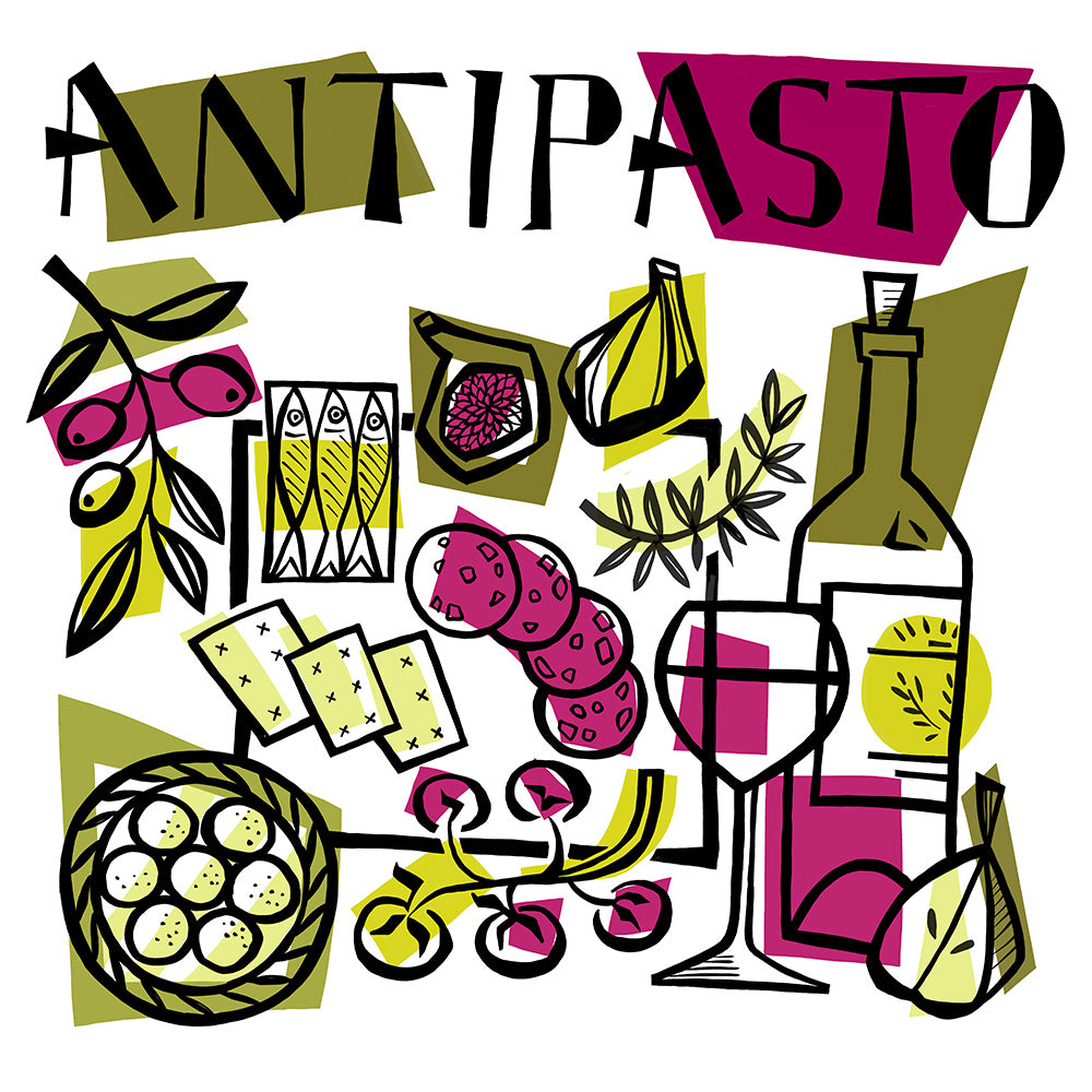 One of a series of four giclee art prints illustrating international cuisine. What better way to start an Italian feast than with a plater of antipasto! Can’t resist.